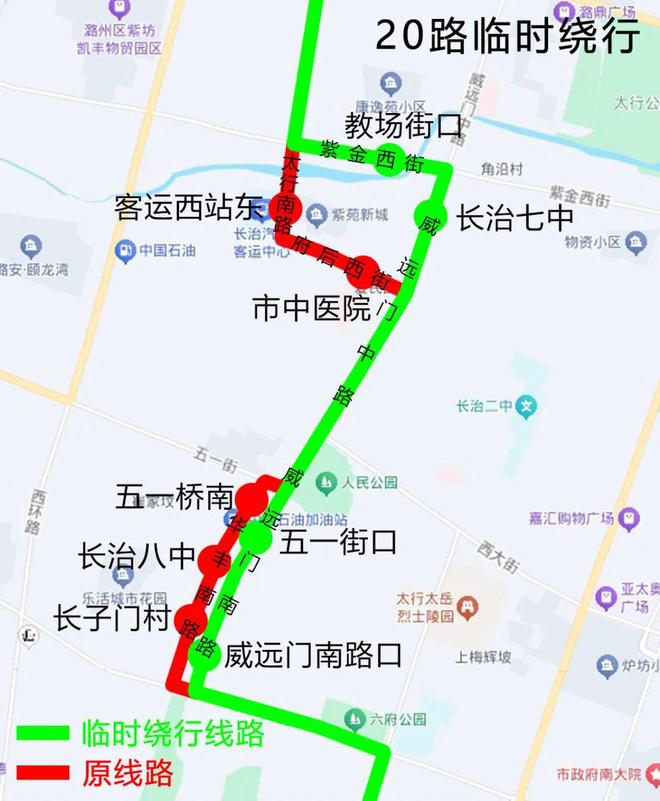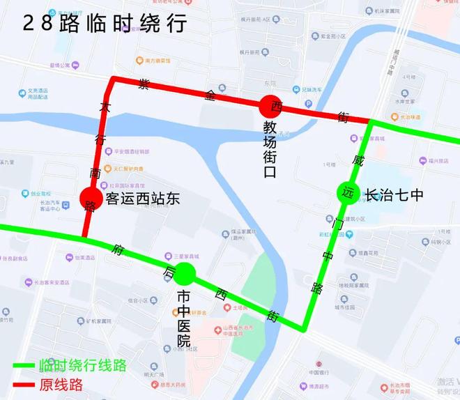自始发站高铁东站始发,行驶至紫金东街威远门中路口向南左转,沿威远门中路(途经长治七中)行至府后西街口向西右转,沿府后西街(途经市中医院)行至太行南路口恢复原线、临时调整的公交线路营运车辆就近停靠公交站点,不再设置临时线九游体育、公交线路走向将根据道路封闭、交通管制及指挥情况进行实时调整或恢复原走向。请广大乘客相互告知,由此带来不便,敬请谅解。长治市公共交通集团有限责任公司